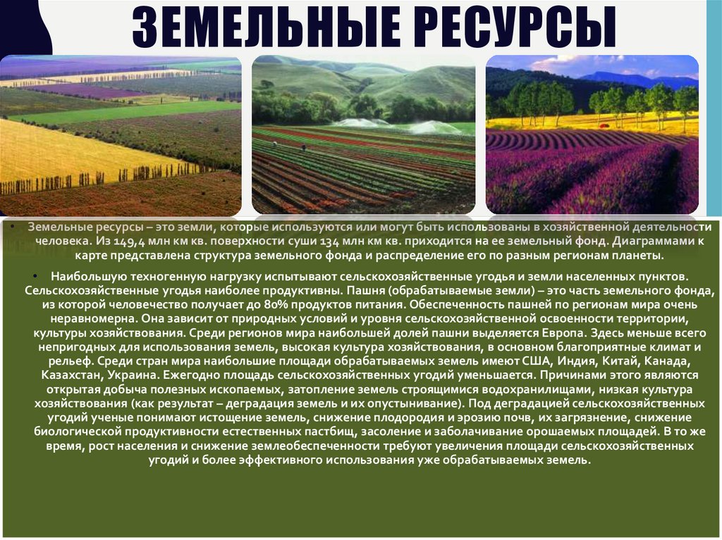 угодий ученые понимают истощение земель, снижение плодородия и эрозию почв, их загрязнение, снижение