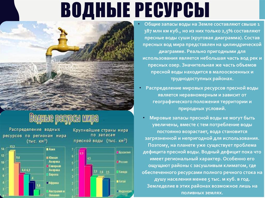 ВОДНЫЕ РЕСУРСЫ• Общие запасы воды на Земле составляют свыше 1