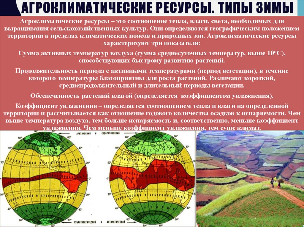 АГРОКЛИМАТИЧЕСКИЕ РЕСУРСЫ. ТИПЫ ЗИМЫАгроклиматические ресурсы – это соотношение тепла, влаги, света, необходимых для
