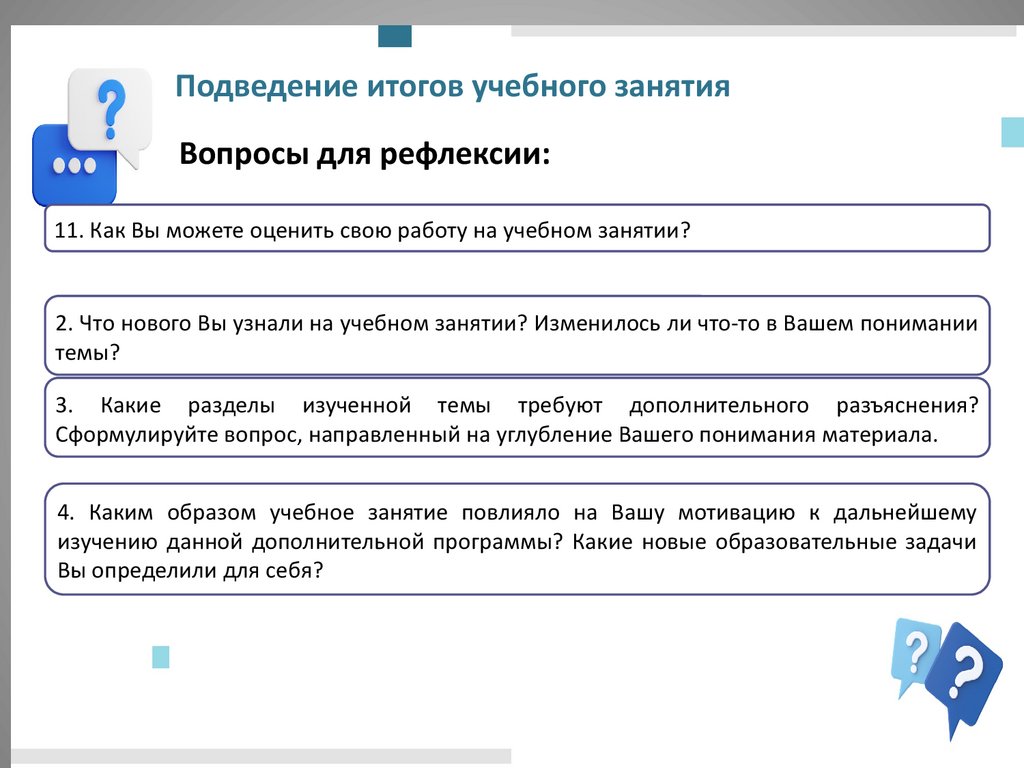 Подведение итогов учебного занятияВопросы для рефлексии: