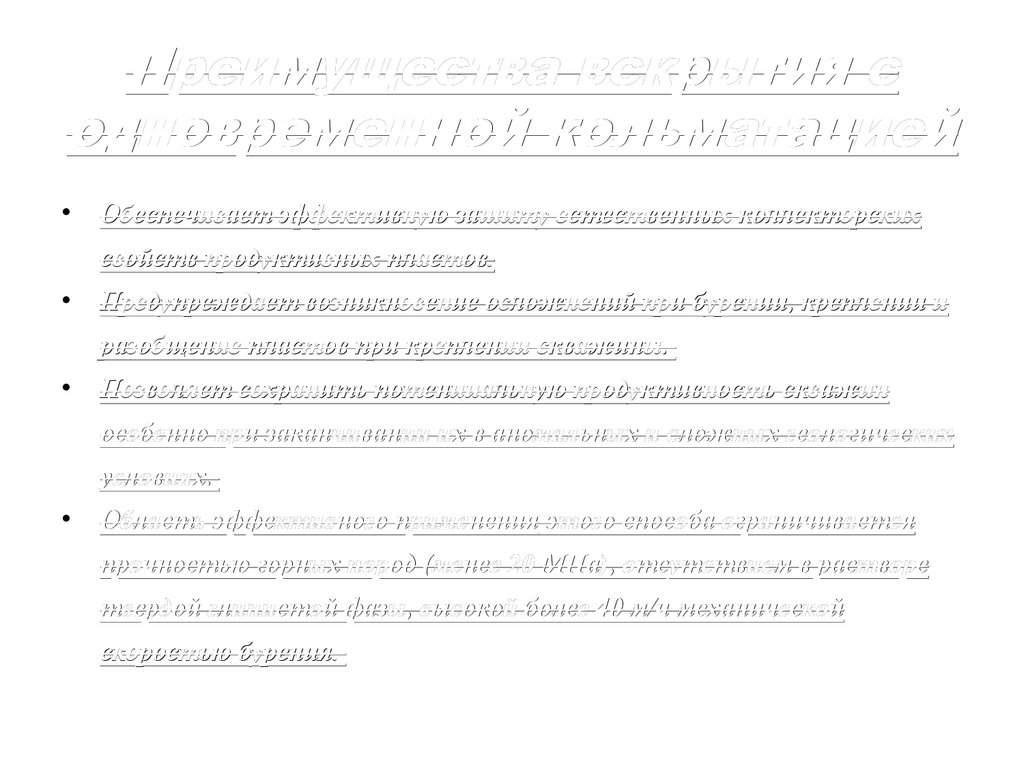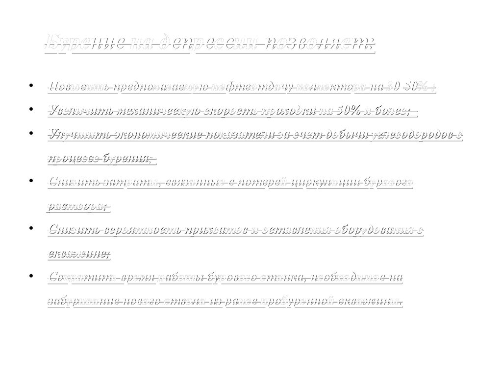 Бурение на депрессии позволяет:Повысить предполагаемую нефтеотдачу коллектора на 30-50% ;