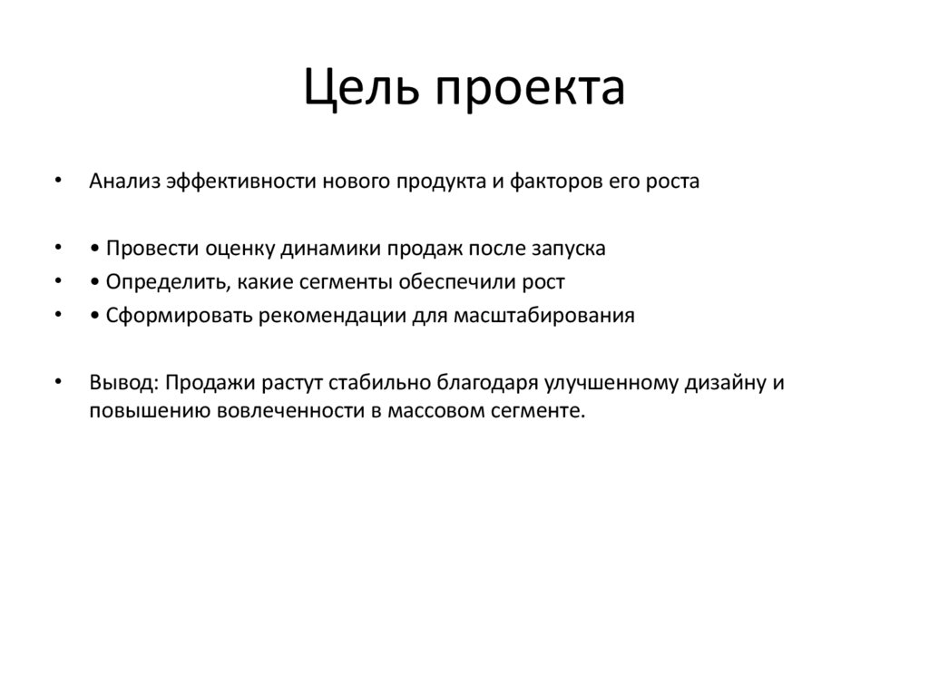 Цель проектаАнализ эффективности нового продукта и факторов его роста
