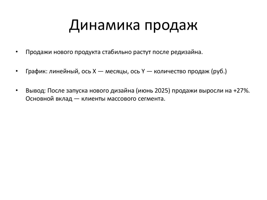 Вывод: После запуска нового дизайна (июнь 2025) продажи выросли на +27%.
