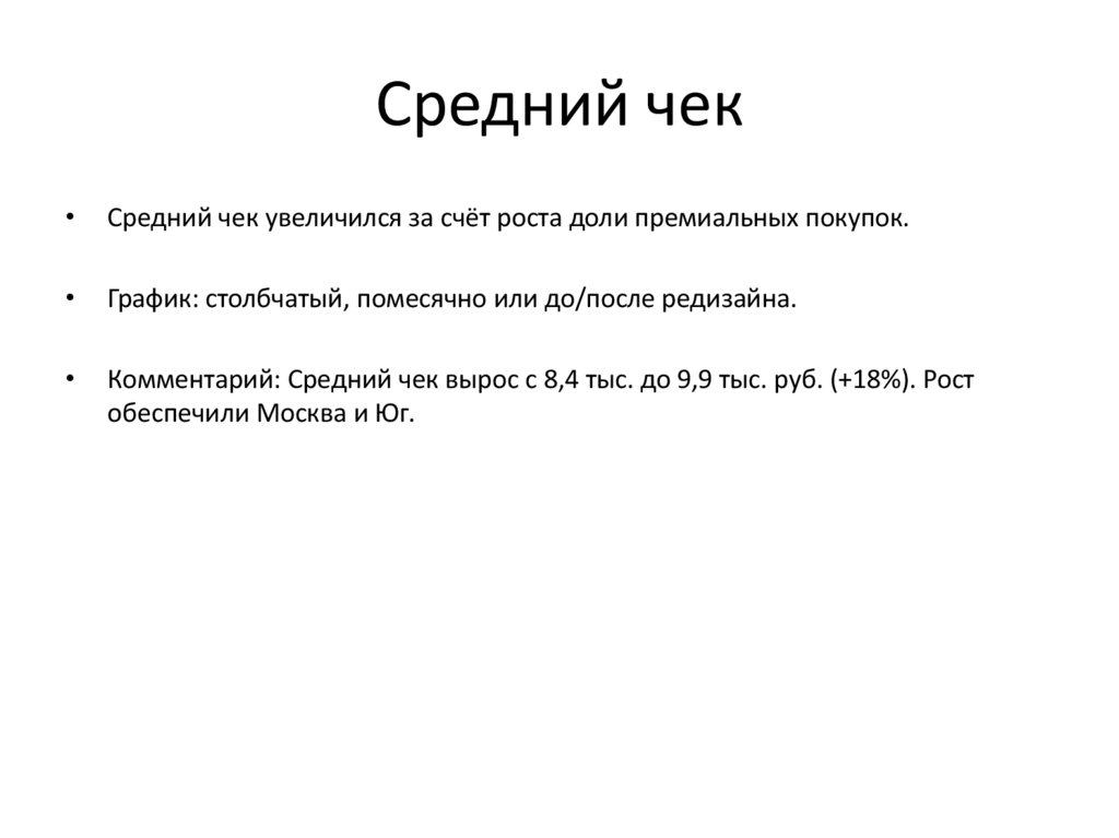 Комментарий: Средний чек вырос с 8,4 тыс. до 9,9 тыс. руб. (+18%). Рост