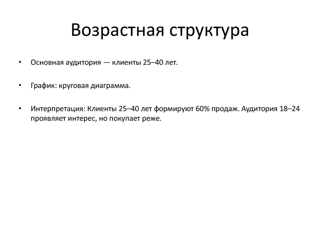 Интерпретация: Клиенты 25–40 лет формируют 60% продаж. Аудитория 18–24
