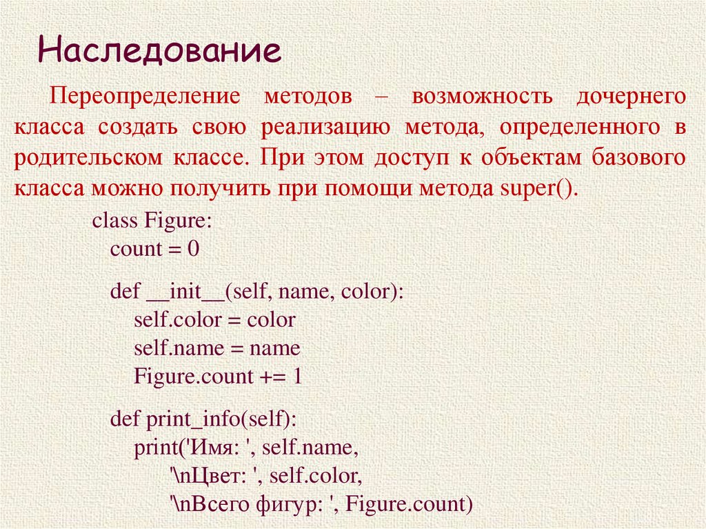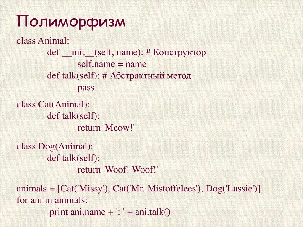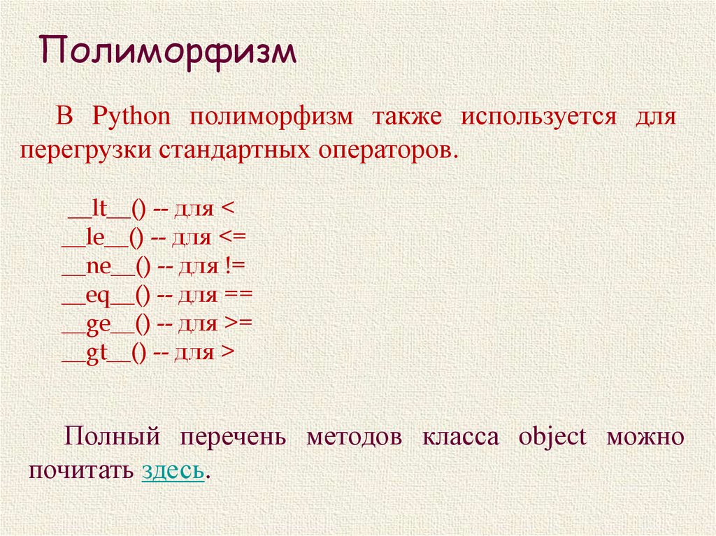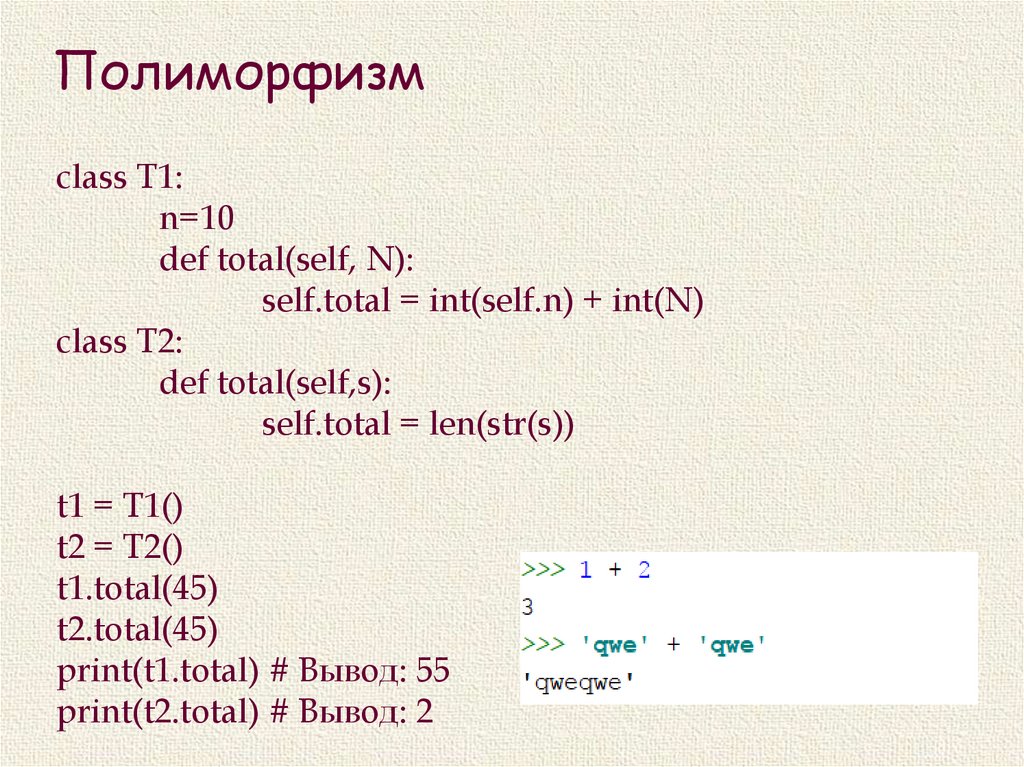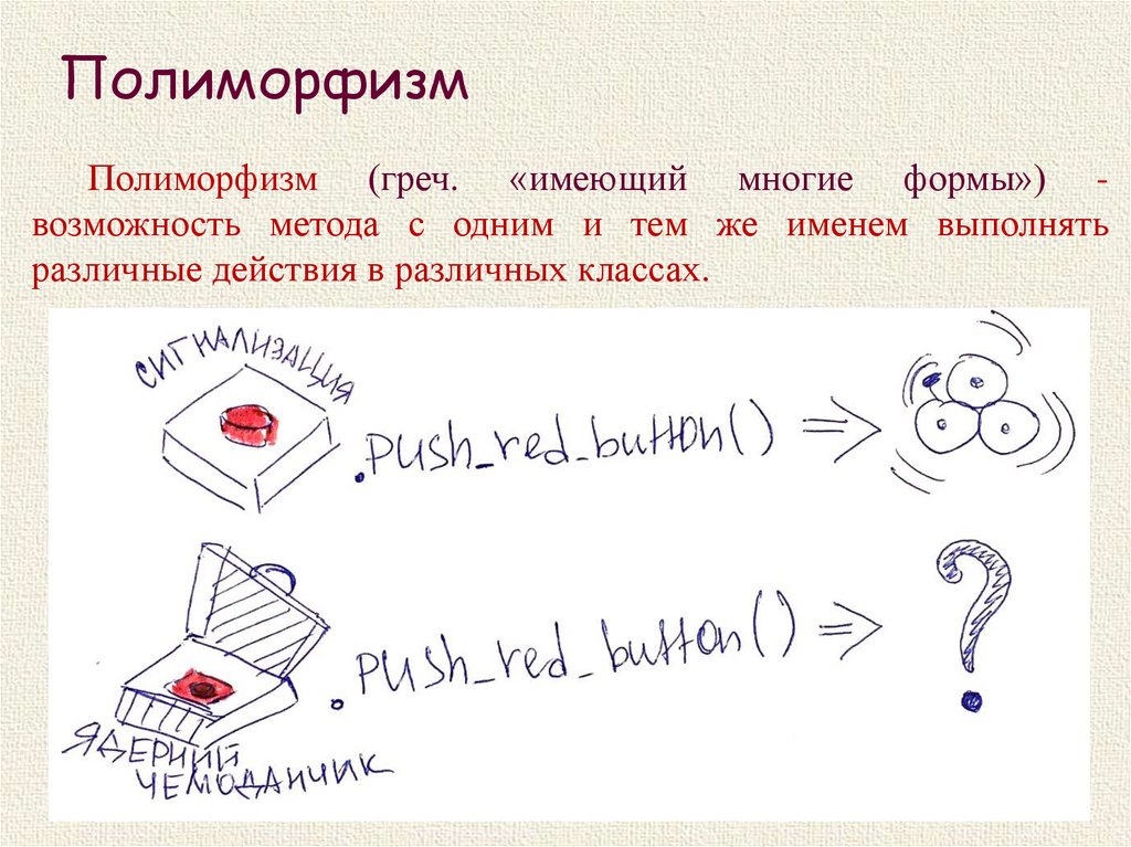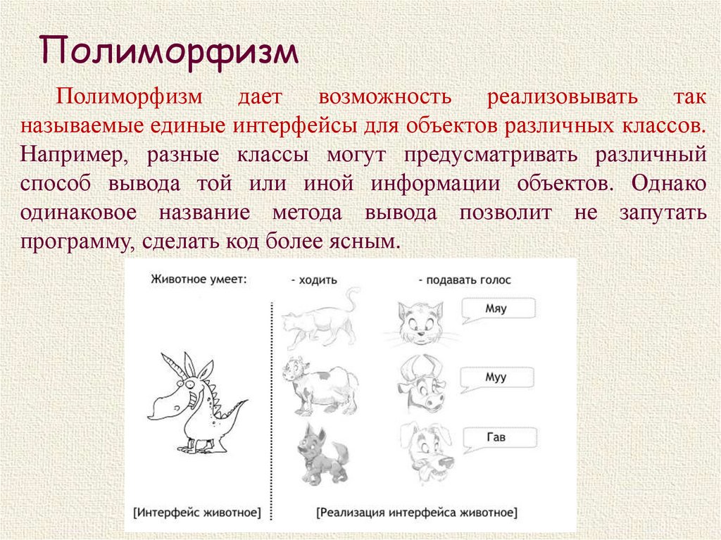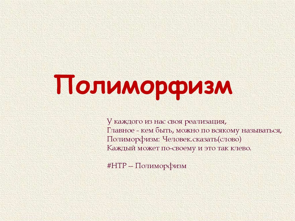 ПолиморфизмПолиморфизм (греч. «имеющий многие формы») возможность метода с одним и тем же именем выполнять
