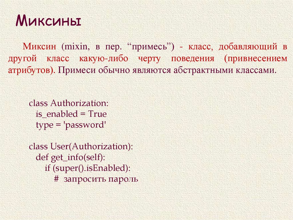 МиксиныМиксин (mixin, в пер. “примесь”) - класс, добавляющий в