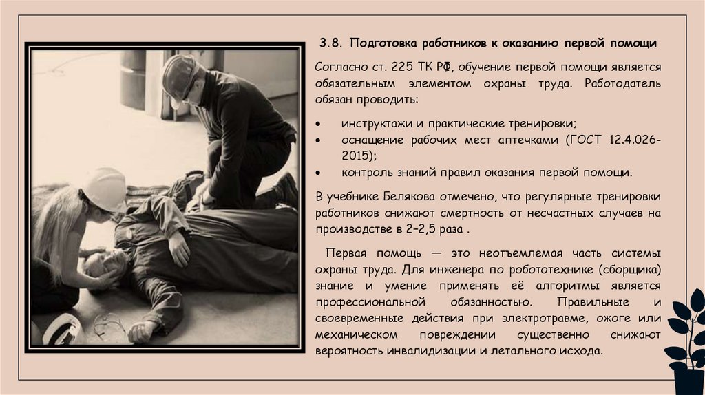 3.8. Подготовка работников к оказанию первой помощиСогласно ст. 225 ТК РФ, обучение первой помощи является