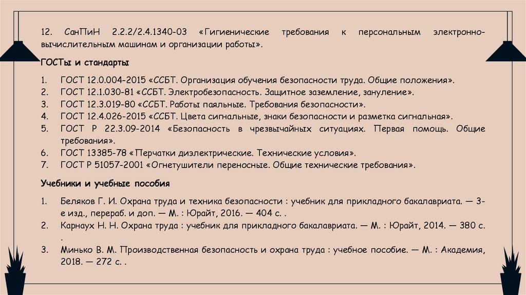 12. СанПиН 2.2.2/2.4.1340-03 «Гигиеническиевычислительным машинам и организации работы».