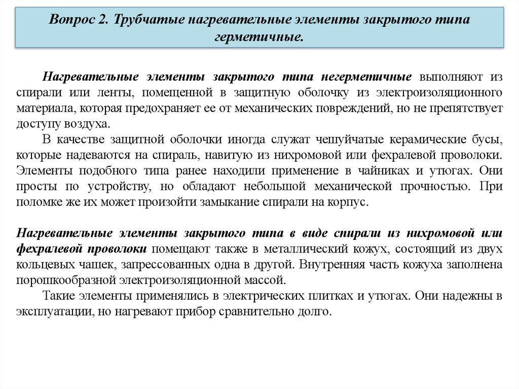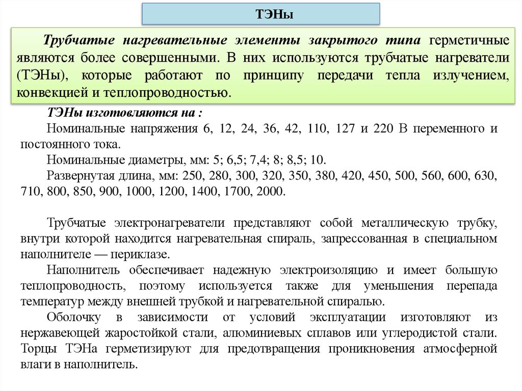 1. Нагревательные элементы открытого типа.2. Трубчатые нагревательные элементы закрытого