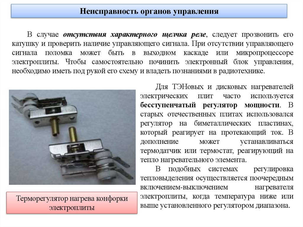 Неисправность органов управленияВ случае отсутствия характерного щелчка реле, следует прозвонить его