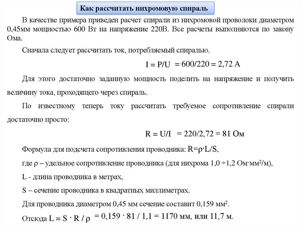 Как рассчитать нихромовую спиральВ качестве примера приведен расчет спирали из нихромовой проволоки диаметром