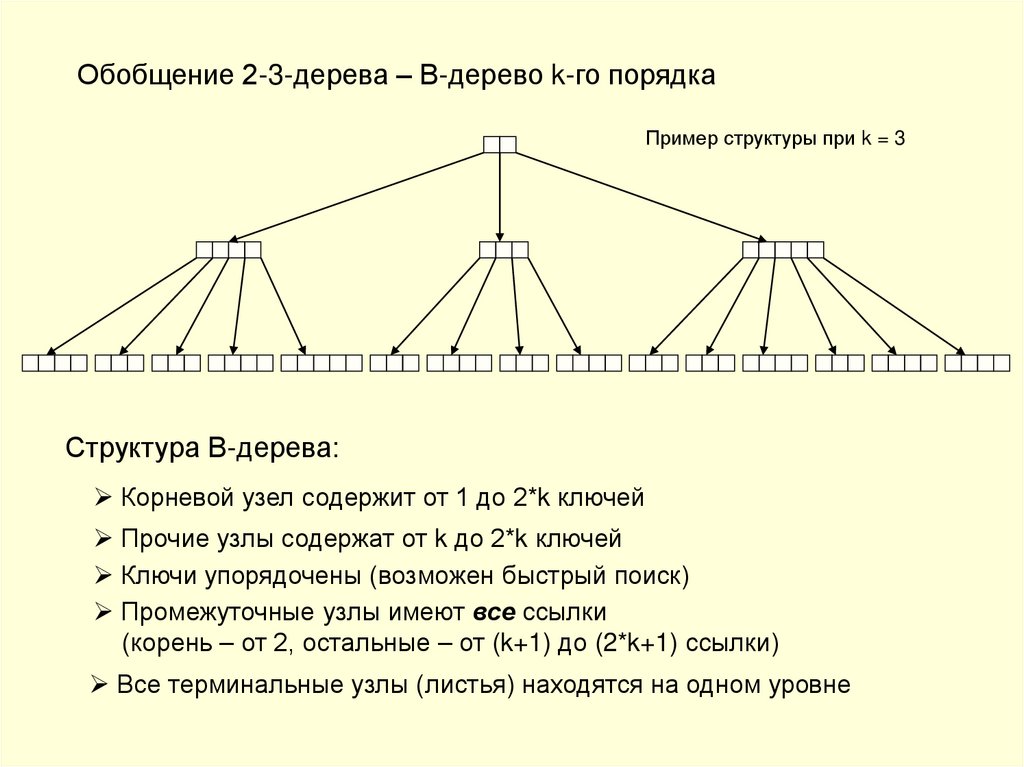 Обобщение 2-3-дерева – В-дерево k-го порядкаПример структуры при k = 3