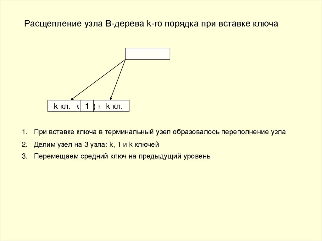 Расщепление узла В-дерева k-го порядка при вставке ключаk кл.