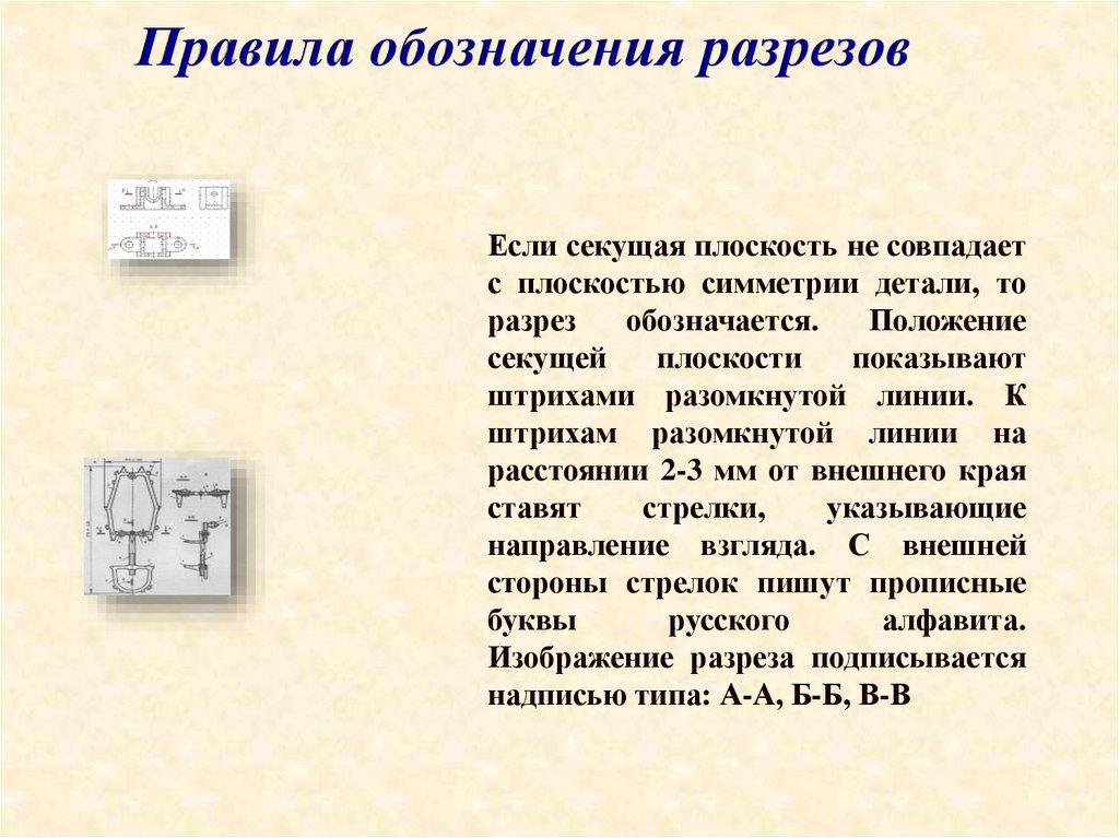 Правила обозначения разрезовЕсли секущая плоскость не совпадает