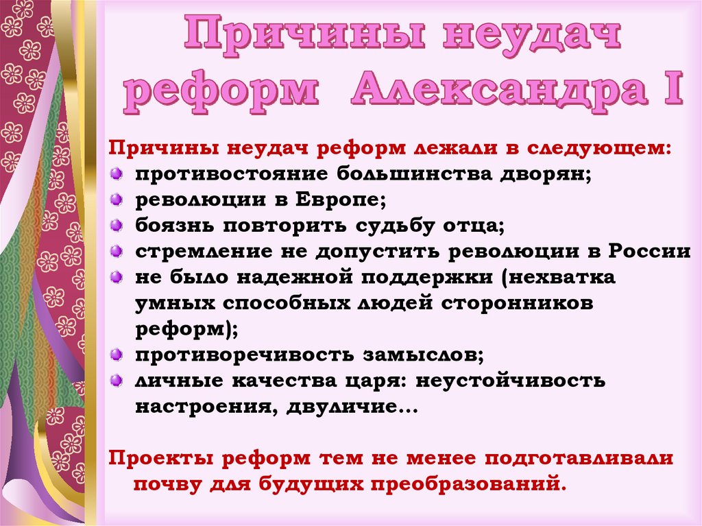 Причины неудач реформ лежали в следующем:противостояние большинства дворян;