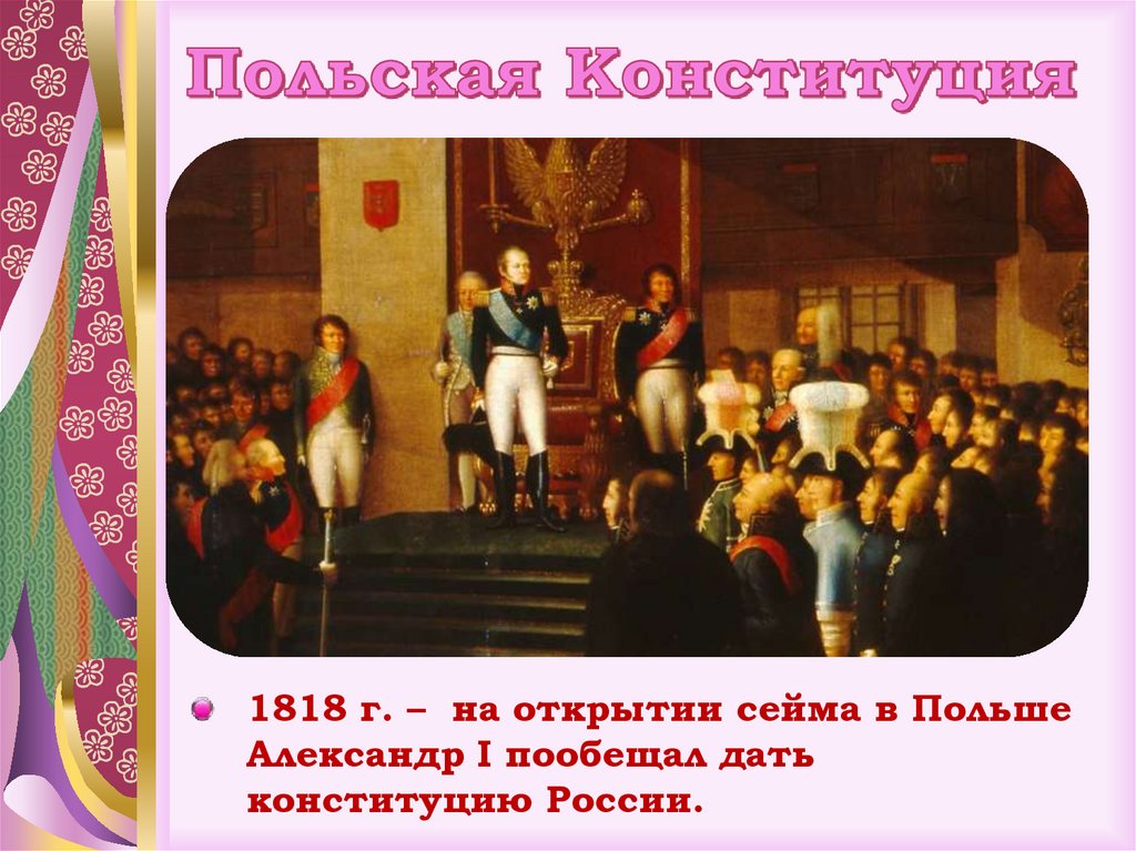 1818 г. – на открытии сейма в ПольшеАлександр I пообещал дать