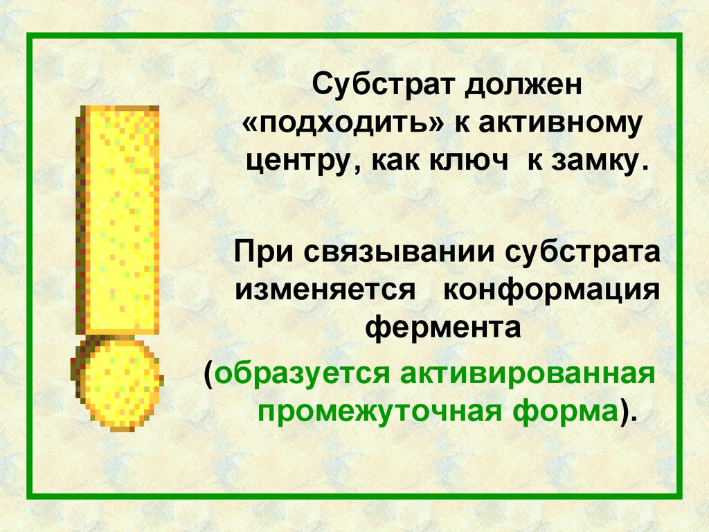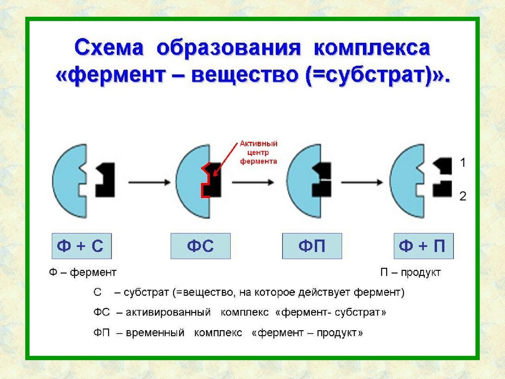 1. Фермент распознаёт субстрат и связывается с ним.2. Образуется активный комплекс, состоящий из