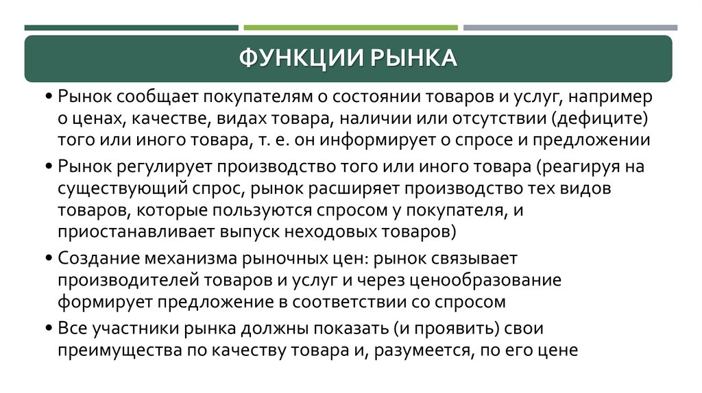 ФУНКЦИИ РЫНКА• Рынок сообщает покупателям о состоянии товаров и услуг, например