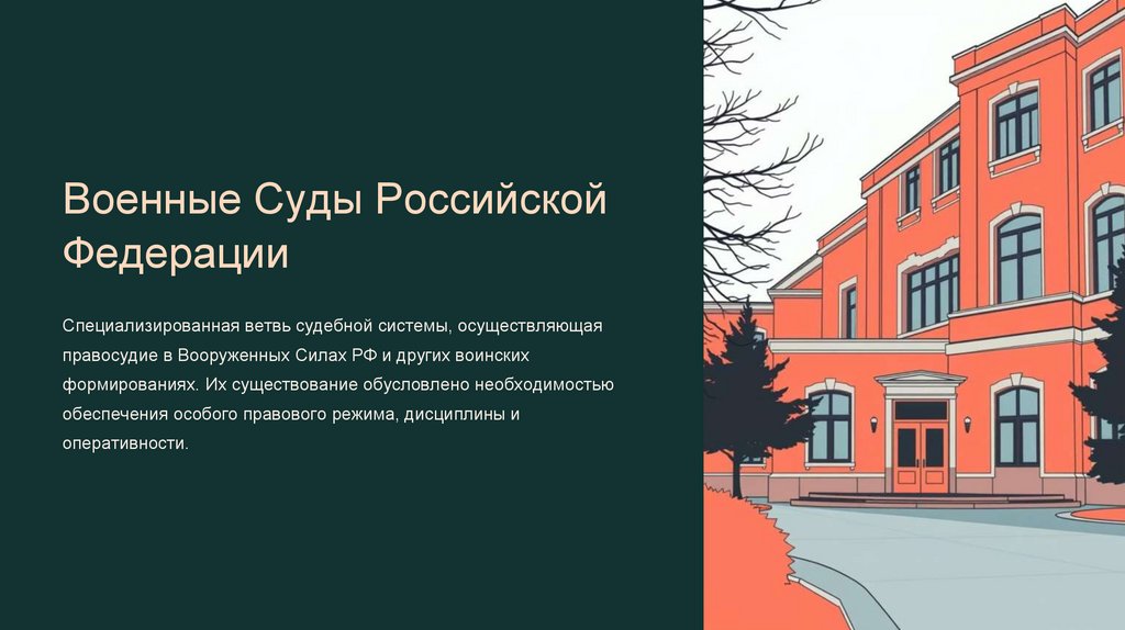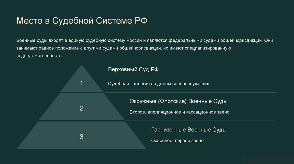 Место в Судебной Системе РФВоенные суды входят в единую судебную систему России и являются федеральными судами общей юрисдикции. Они