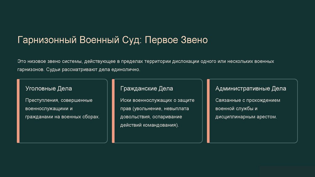 Гарнизонный Военный Суд: Первое ЗвеноЭто низовое звено системы, действующее в пределах территории дислокации одного или нескольких военных