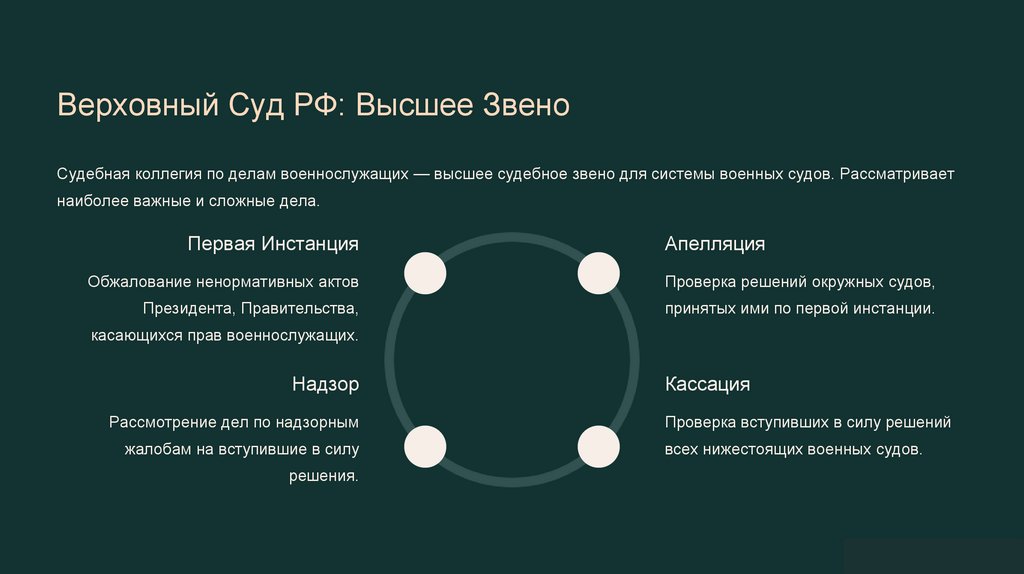 Верховный Суд РФ: Высшее ЗвеноСудебная коллегия по делам военнослужащих — высшее судебное звено для системы военных судов. Рассматривает