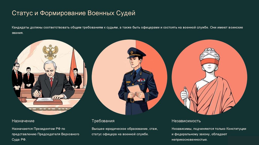Статус и Формирование Военных СудейКандидаты должны соответствовать общим требованиям к судьям, а также быть офицерами и состоять на военной службе. Они имеют воинские