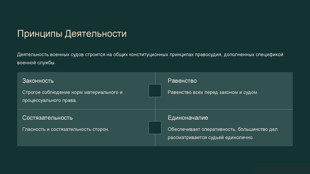 Принципы ДеятельностиДеятельность военных судов строится на общих конституционных принципах правосудия, дополненных спецификой