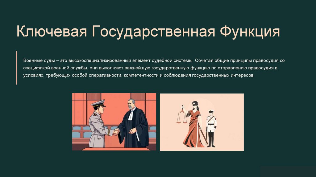 Ключевая Государственная ФункцияВоенные суды – это высокоспециализированный элемент судебной системы. Сочетая общие принципы правосудия со