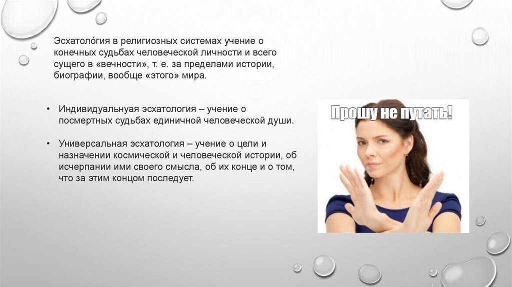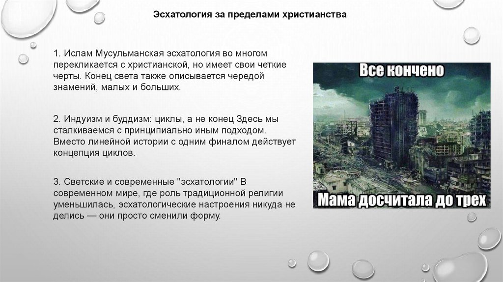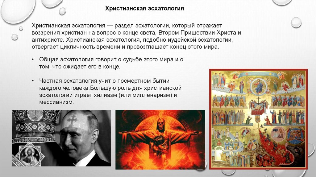 Эсхатоло́гия в религиозных системах учение оконечных судьбах человеческой личности и всего