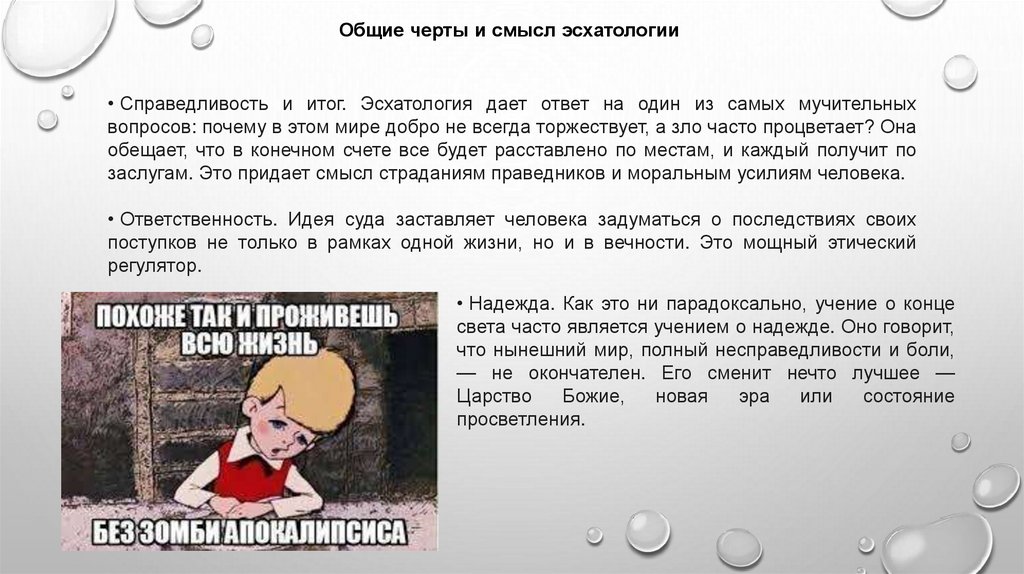 Общие черты и смысл эсхатологии• Справедливость и итог. Эсхатология дает ответ на один из самых мучительных
