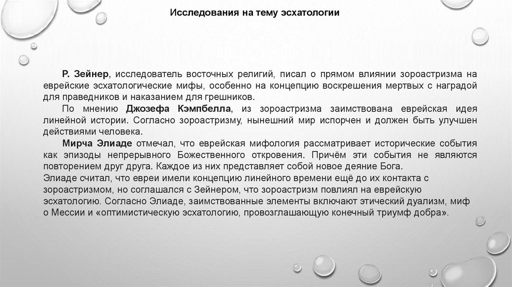 Исследования на тему эсхатологииР. Зейнер, исследователь восточных религий, писал о прямом влиянии зороастризма на