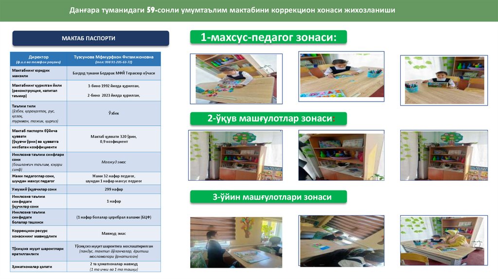 Данғара туманидаги 59-сонли умумтаълим мактабини коррекцион хонаси жихозланишиМАКТАБ ПАСПОРТИ