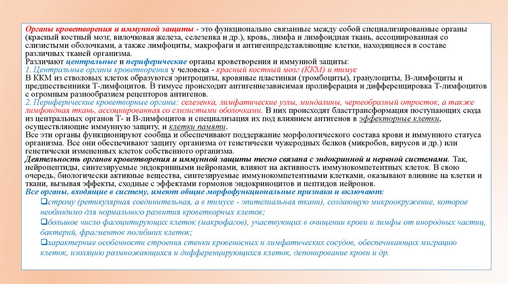 Органы кроветворения и иммунной защиты - это функционально связанные между собой специализированные органы(красный костный мозг, вилочковая железа, селезенка и др.), кровь, лимфа и лимфоидная ткань, ассоциированная со
