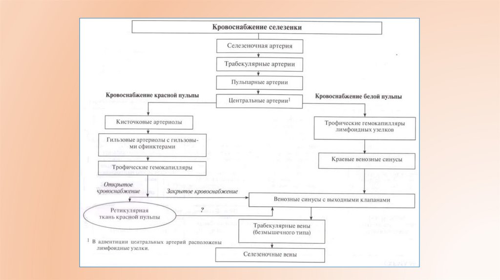 депонируется в селезенке. Отток венозной крови совершается по системе вен. Трабекулярные вены лишены мышечного слоя.