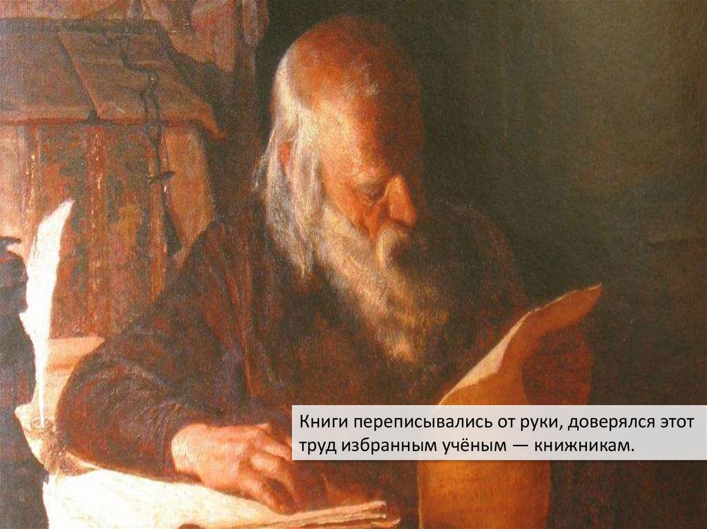 Книги переписывались от руки, доверялся этоттруд избранным учёным — книжникам.