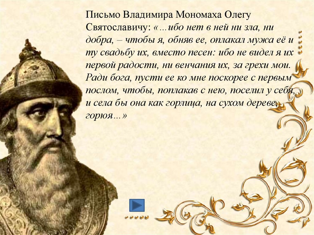 Письмо Владимира Мономаха ОлегуСвятославичу: «…ибо нет в ней ни зла, ни