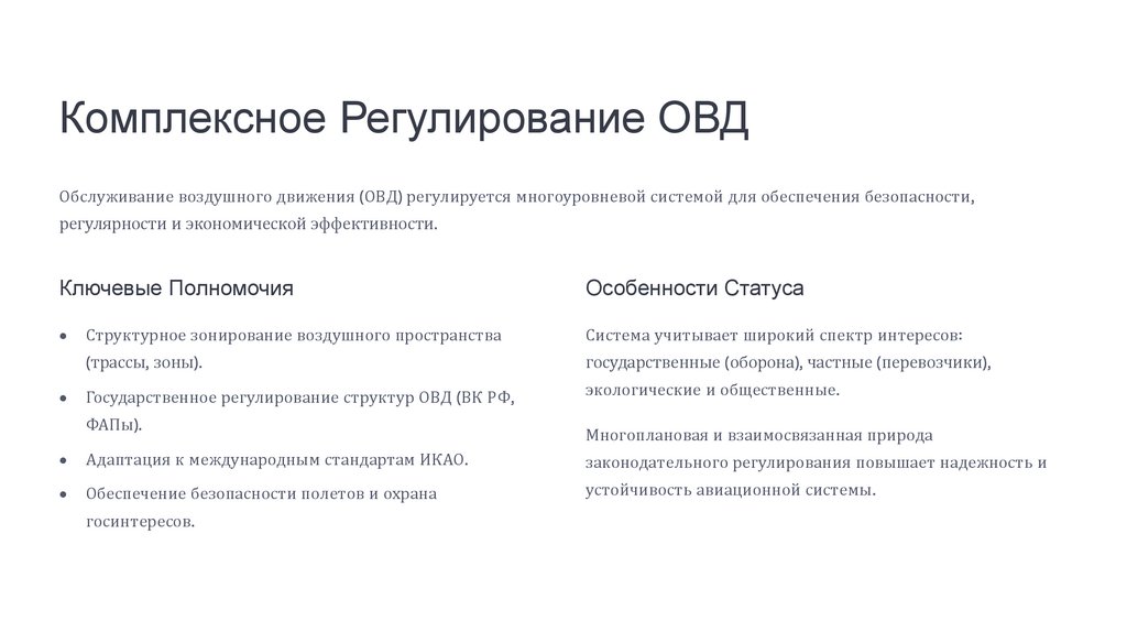 Комплексное Регулирование ОВДОбслуживание воздушного движения (ОВД) регулируется многоуровневой системой для обеспечения безопасности,