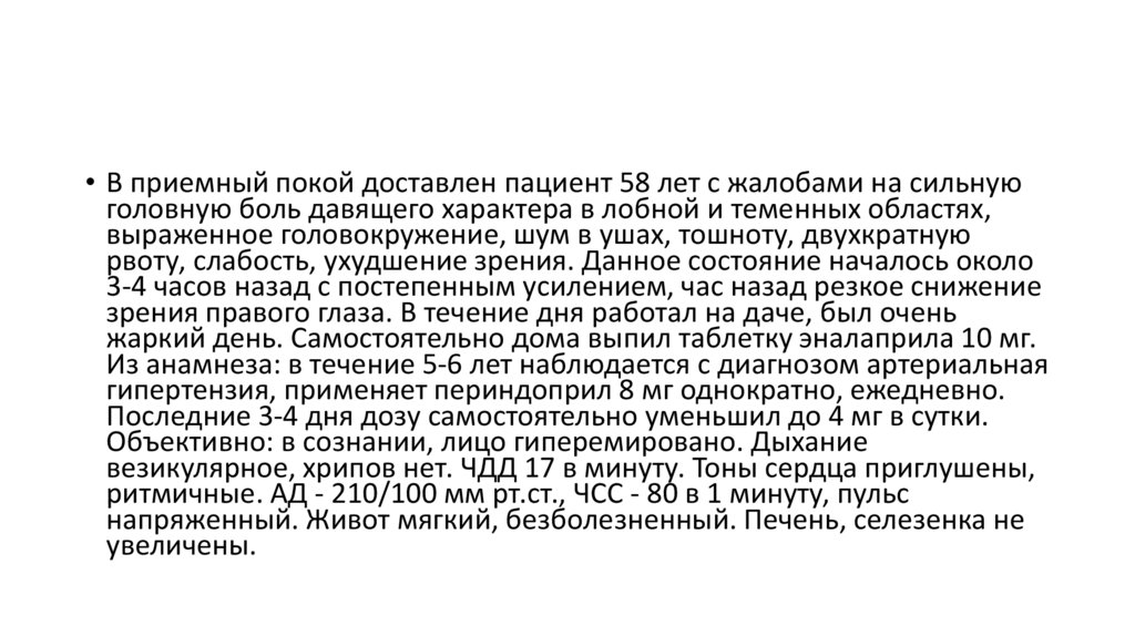 • В приемный покой доставлен пациент 58 лет с жалобами на сильнуюголовную боль давящего характера в лобной и теменных областях,