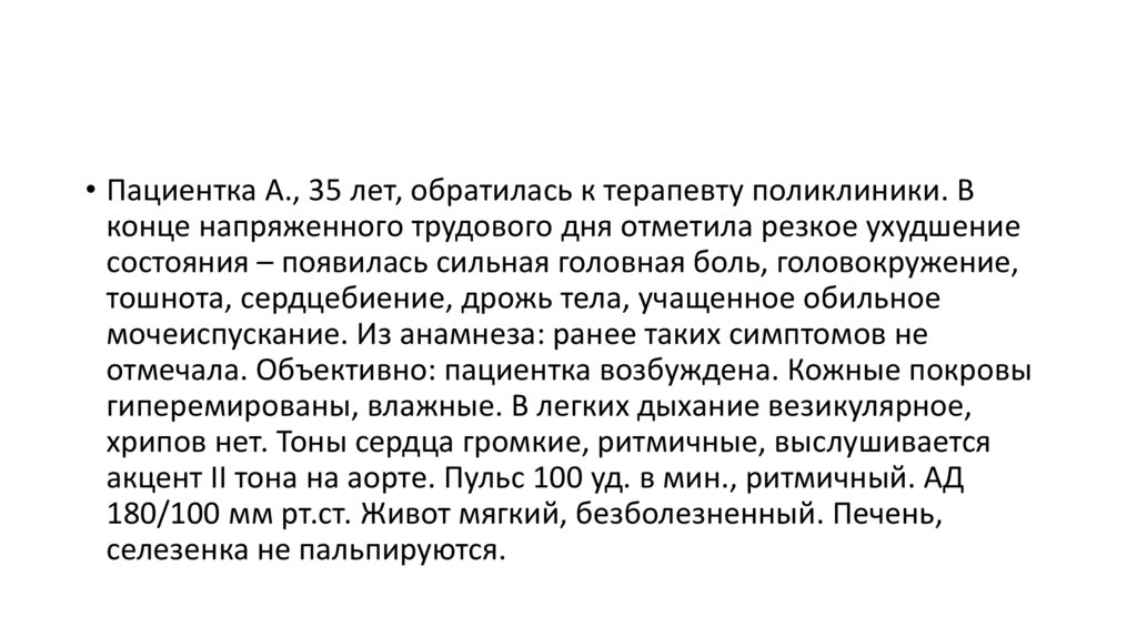 • Пациентка А., 35 лет, обратилась к терапевту поликлиники. Вконце напряженного трудового дня отметила резкое ухудшение