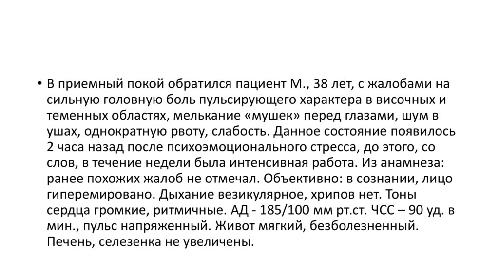 • В приемный покой обратился пациент М., 38 лет, с жалобами насильную головную боль пульсирующего характера в височных и