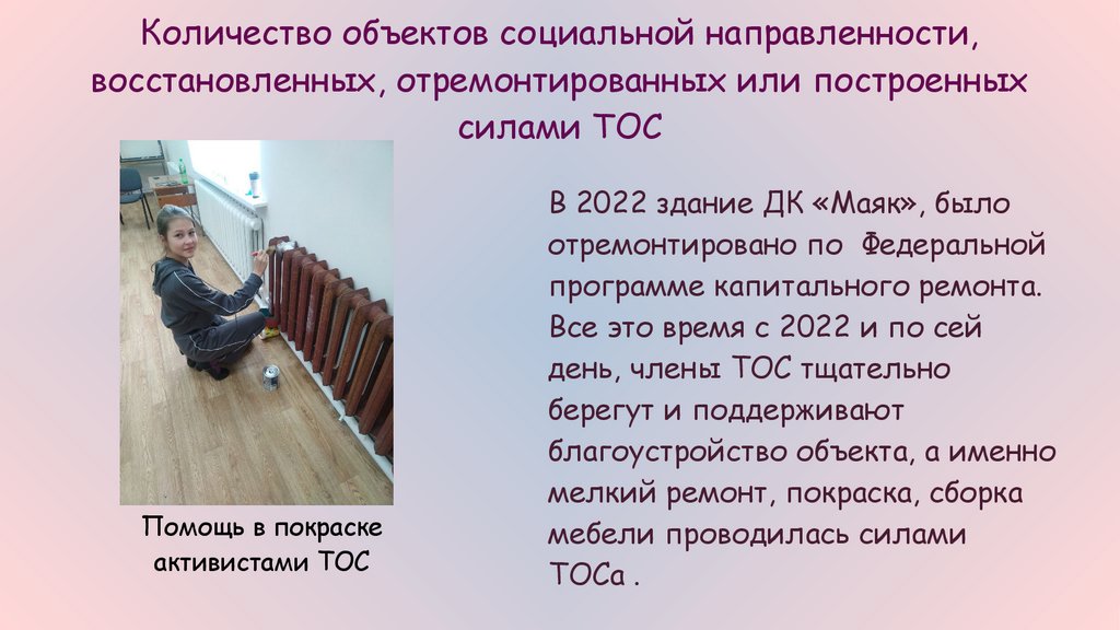 Количество объектов социальной направленности,восстановленных, отремонтированных или построенных