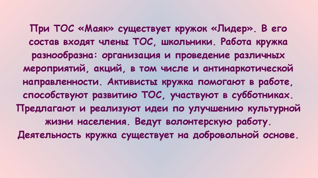 При ТОС «Маяк» существует кружок «Лидер». В егосостав входят члены ТОС, школьники. Работа кружка