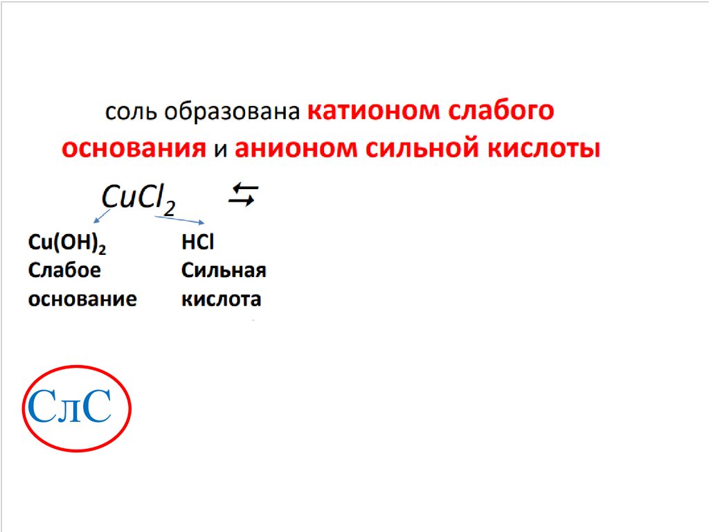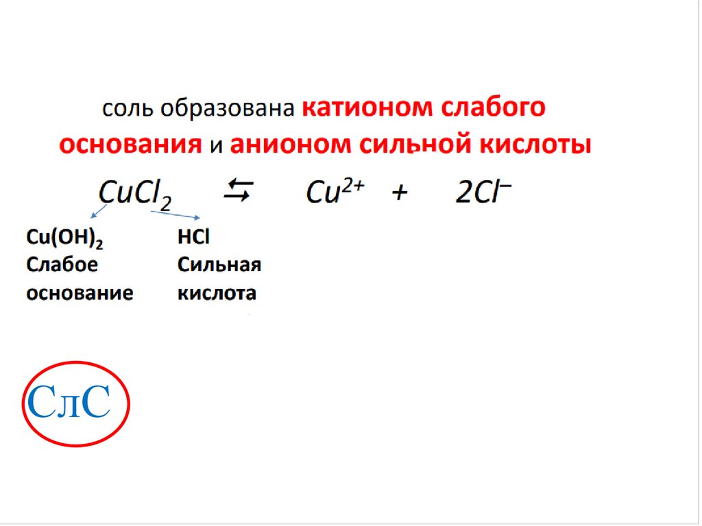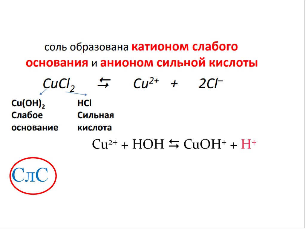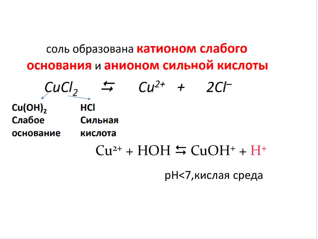 Cu2+ + HOH CuOH+ + H+pH<7,кислая среда