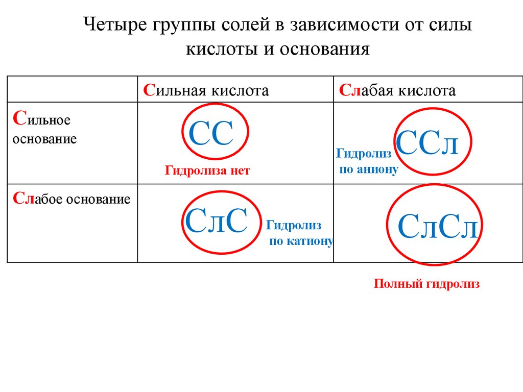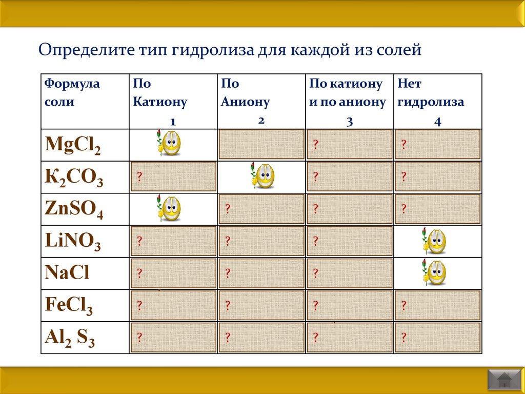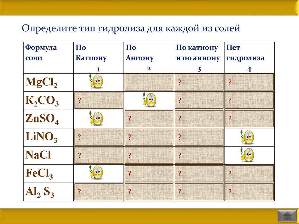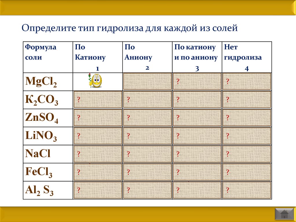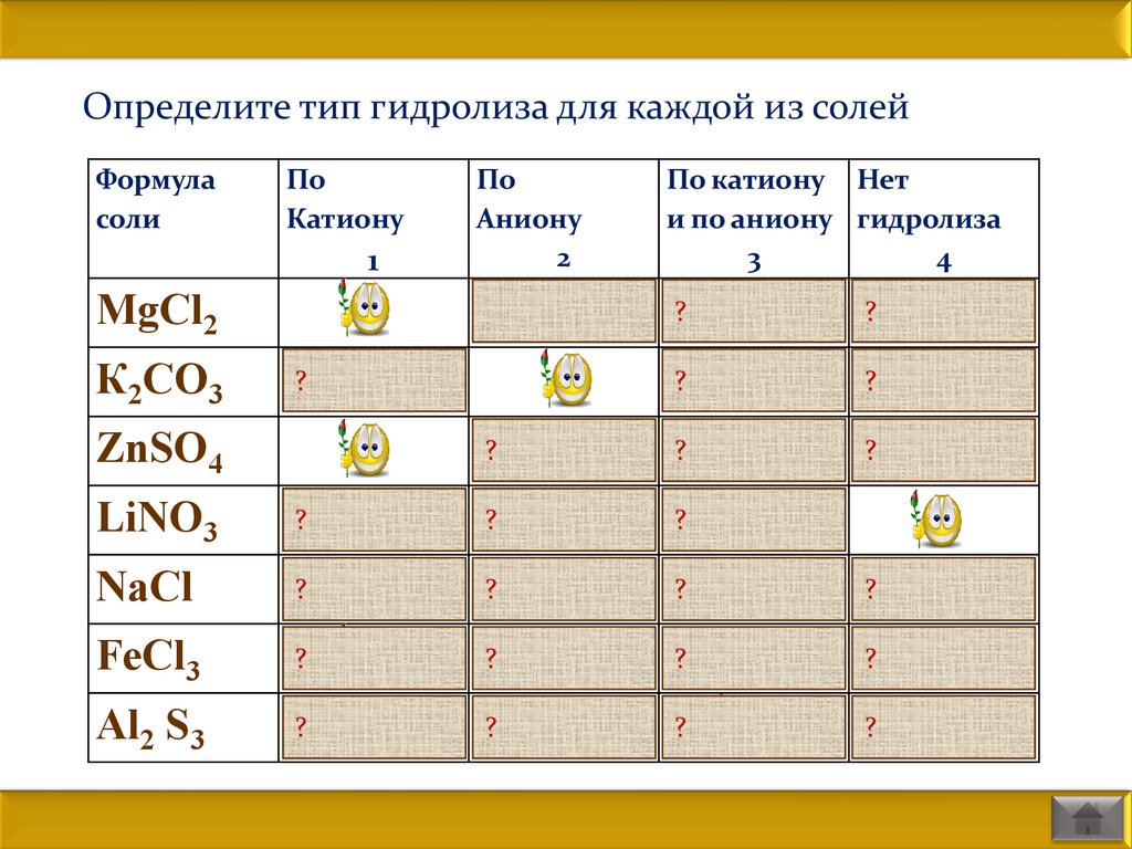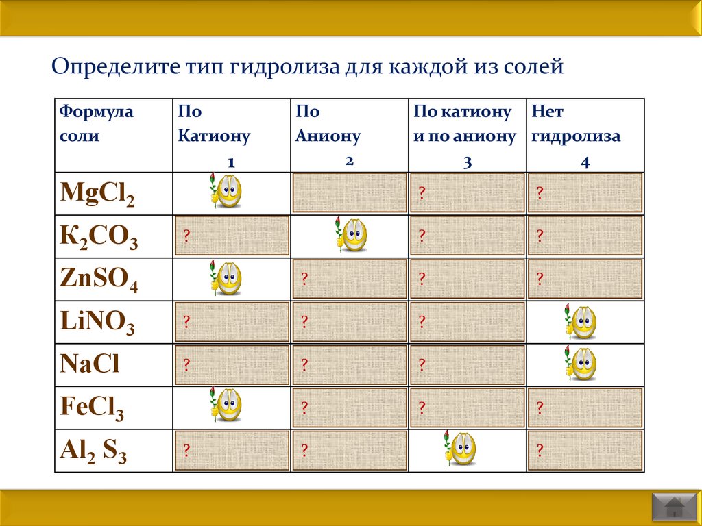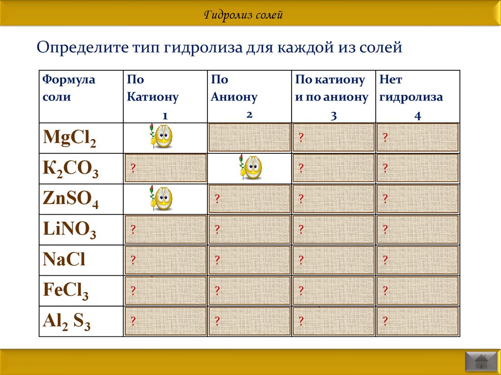 Гидролиз солейОпределите тип гидролиза для каждой из солей
