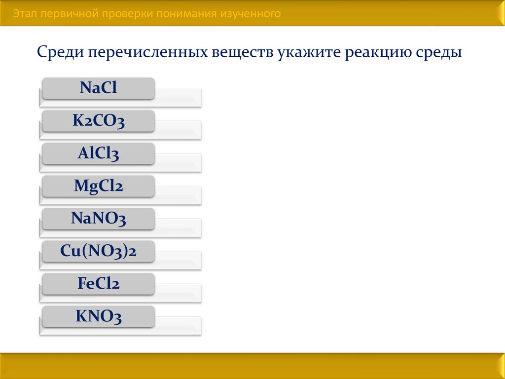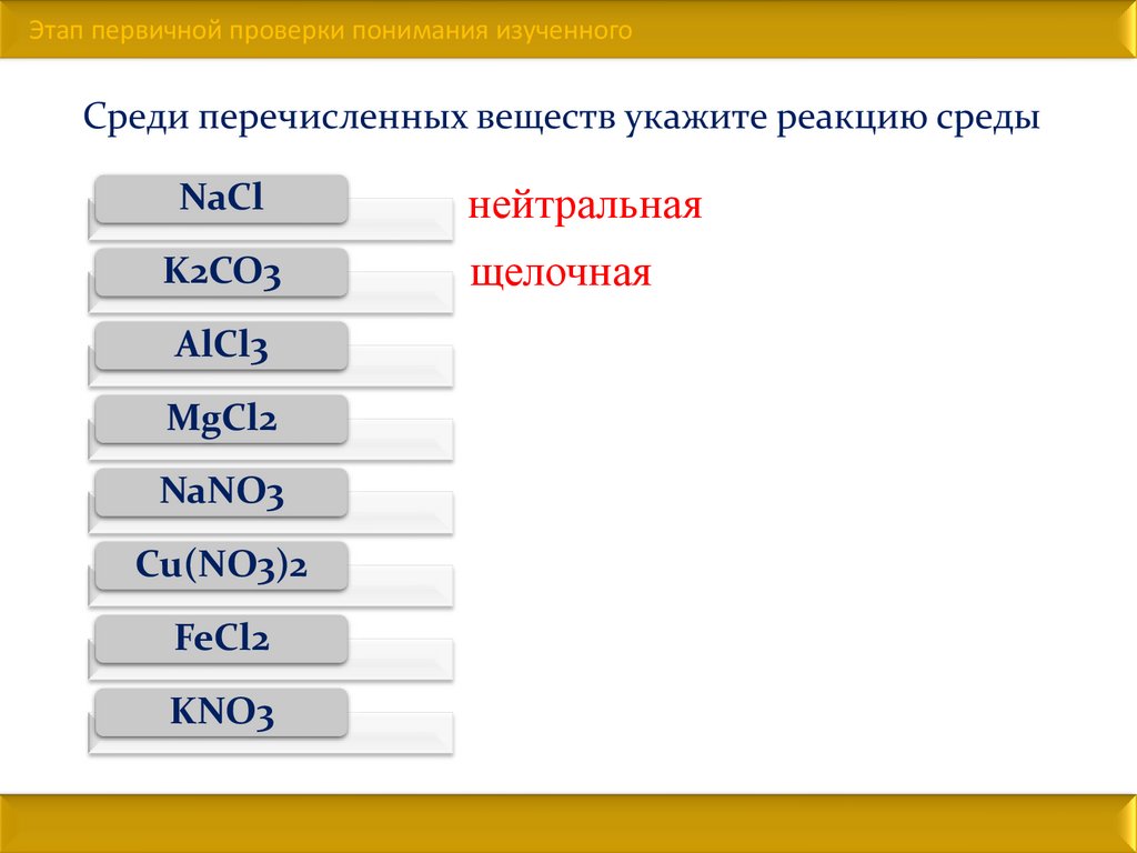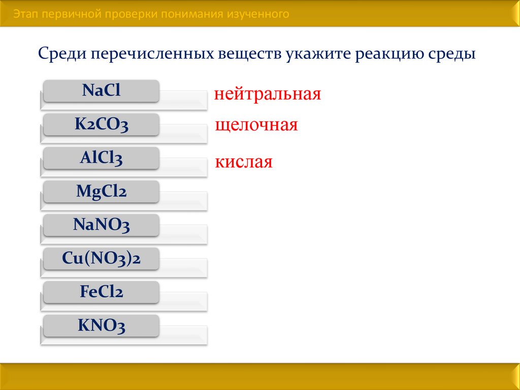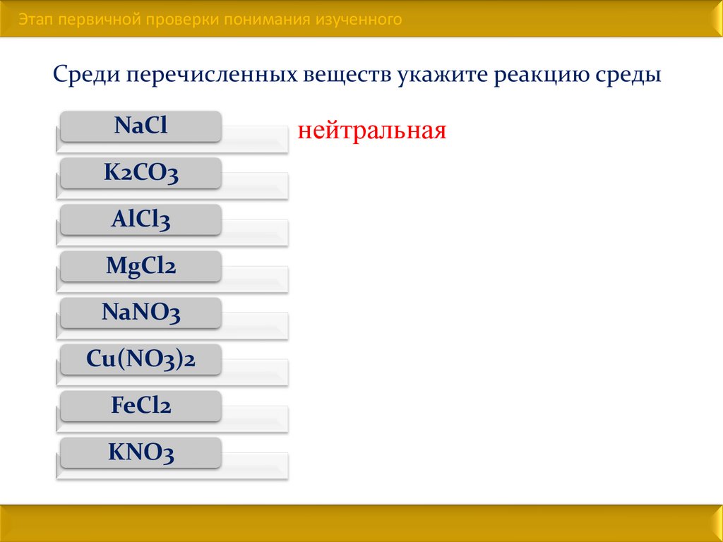 Этап первичной проверки понимания изученногоСреди перечисленных веществ укажите реакцию среды