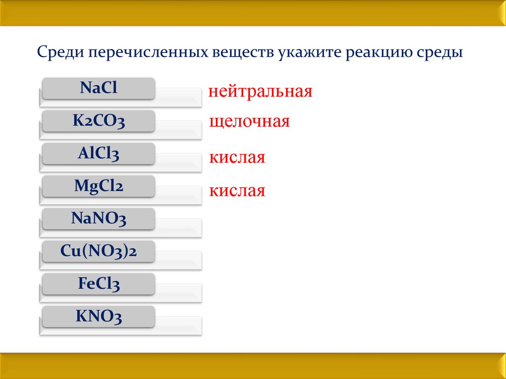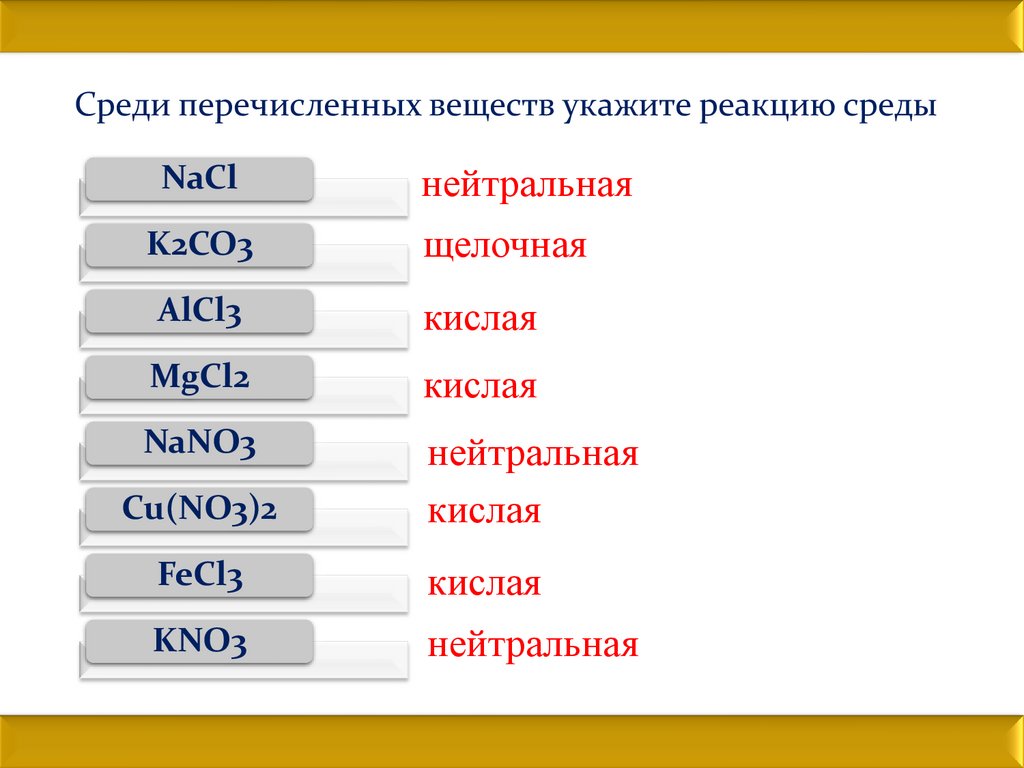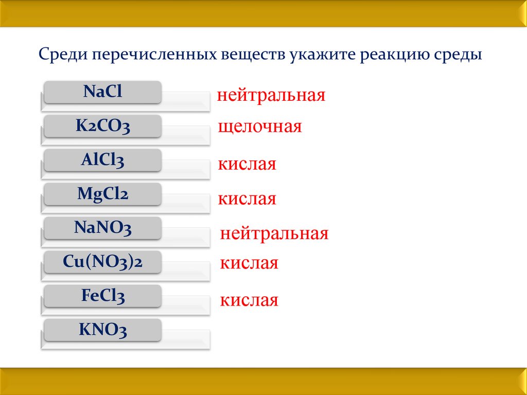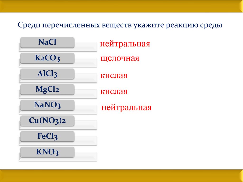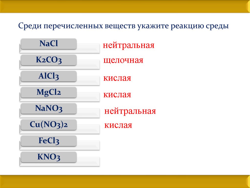 Этап первичной проверки понимания изученногоСреди перечисленных веществ укажите реакцию среды
