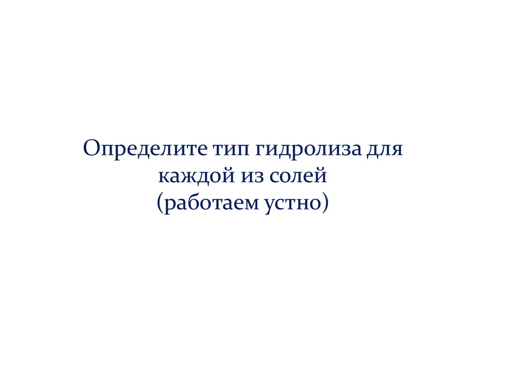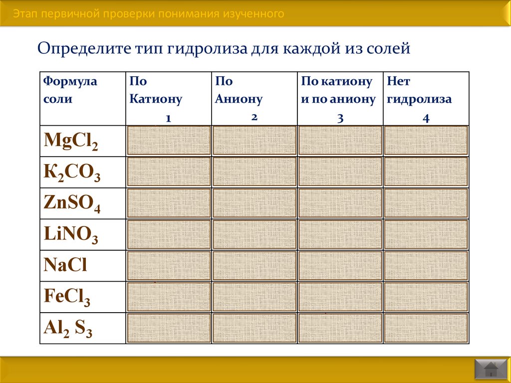 Этап первичной проверки понимания изученногоОпределите тип гидролиза для каждой из солей