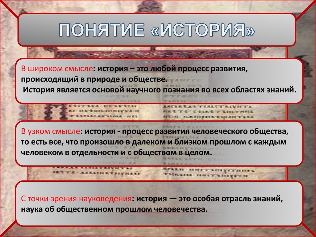 В широком смысле: история – это любой процесс развития,происходящий в природе и обществе.