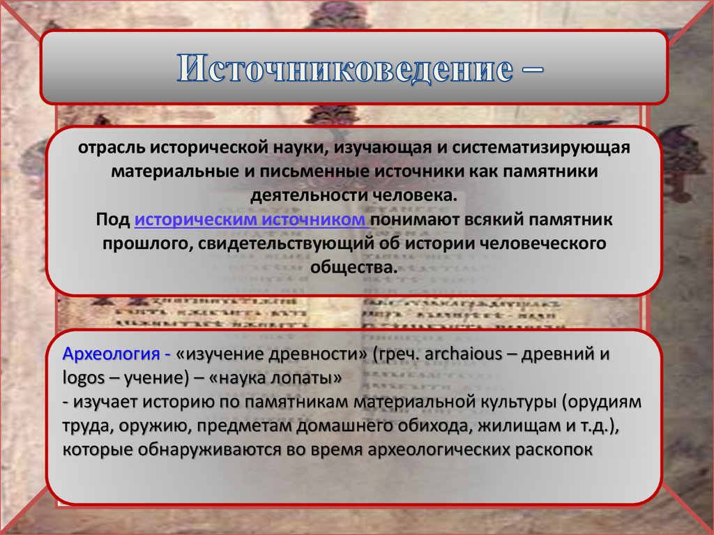 отрасль исторической науки, изучающая и систематизирующаяматериальные и письменные источники как памятники